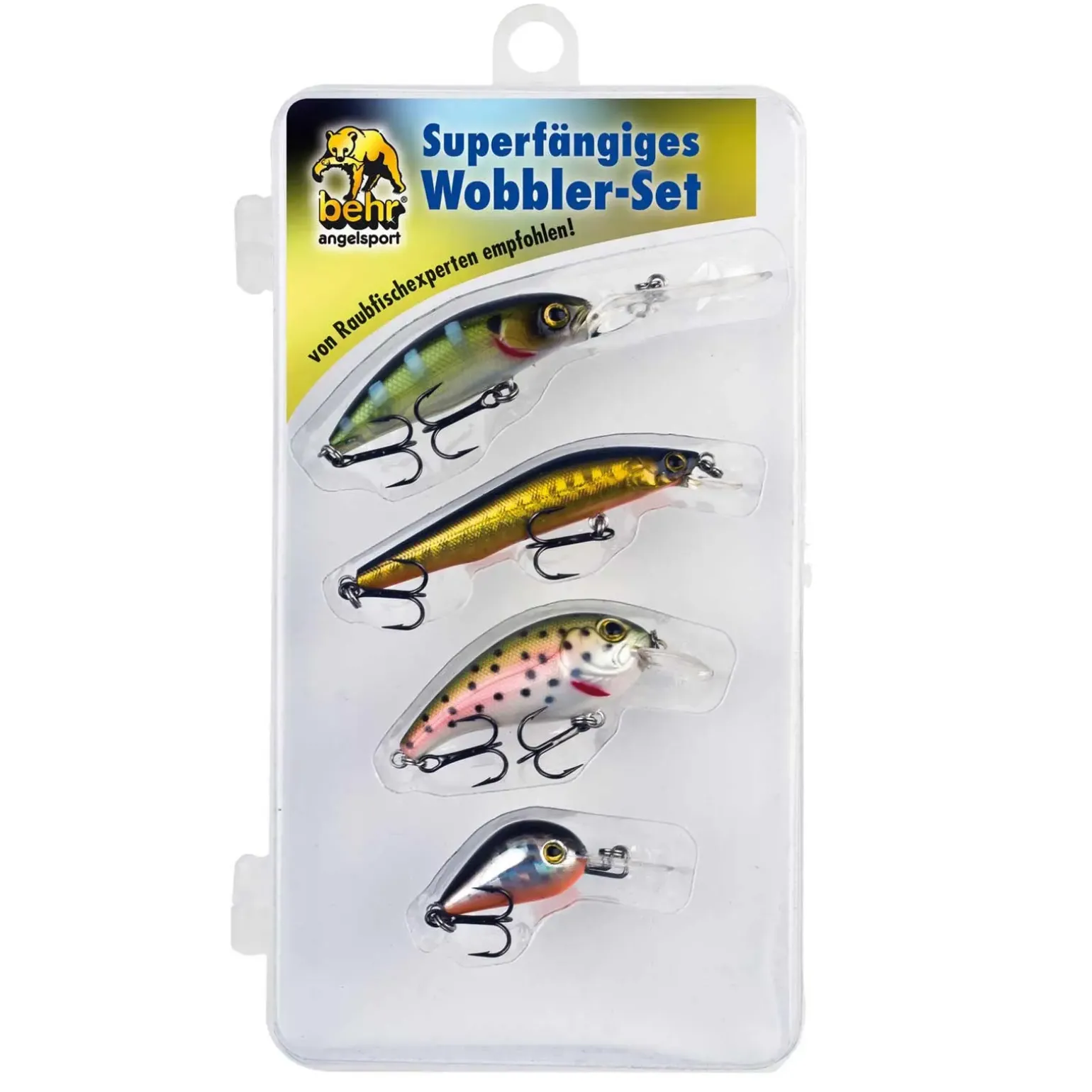 Merkmale Behr Barsch Forelle Wobbler Set: 4 fangstarke Wobbler – Ausstattung mit scharfen Drillingshaken – Zielfische sind Barsch und Forelle – Länge von 2,5 bis 6,0 Zentimeter.