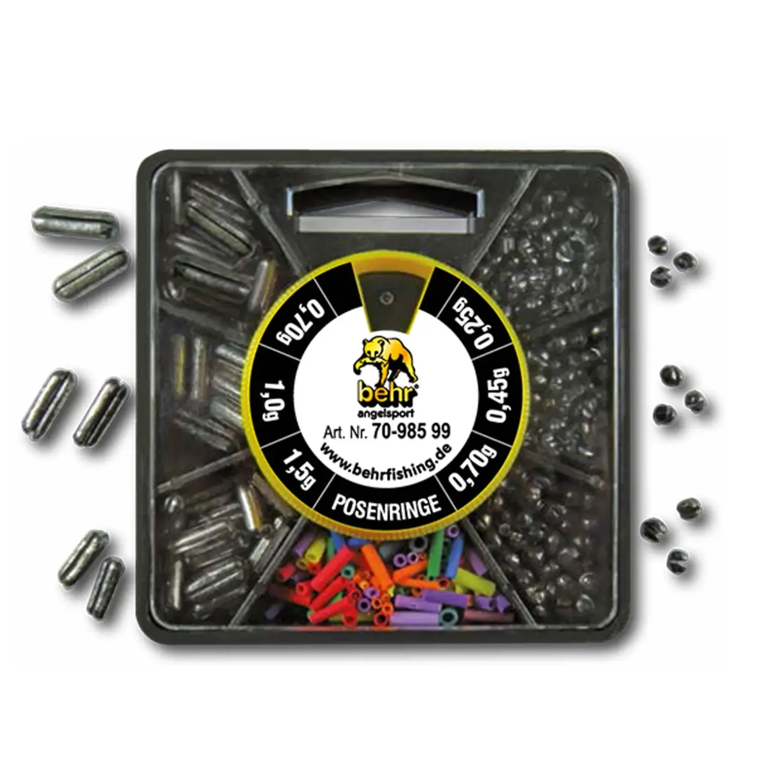 Behr Bleisortiment mit Schrotblei, Stiftbleien und Posenringen.
