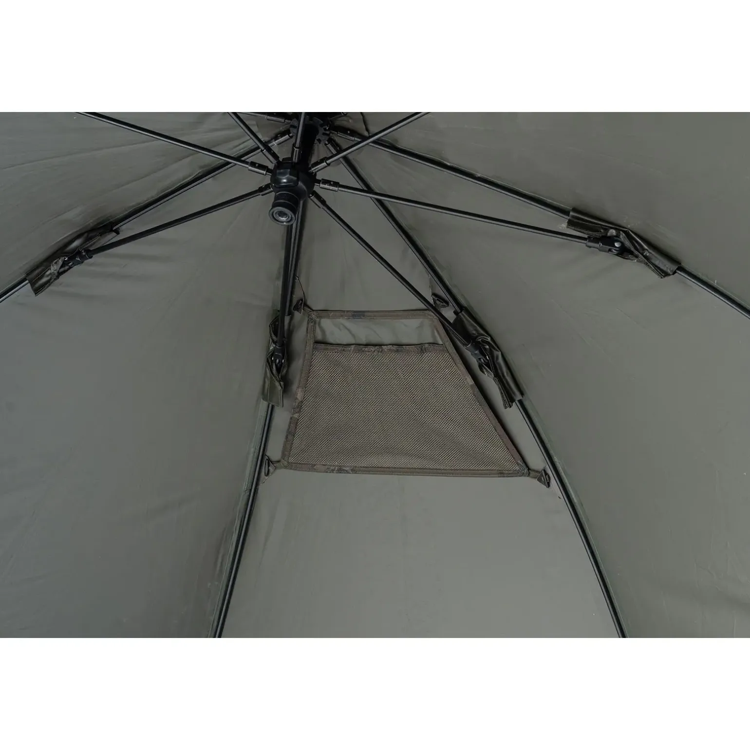 Der verlängerte innere Bodenstreifen ist so konstruiert, dass die Füße der Schlafsysteme darauf platziert werden können, um den Brolly auf Holzstegen oder Betonflächen zu fixieren, wo das fixieren mit Heringen unmöglich ist.