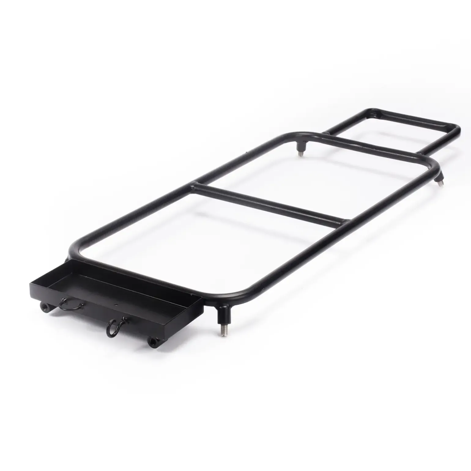 Auf der viereckigen Metallablage sind Fingerschutz, Popup Dosen, Rig-Tools sofort und allzeit griffbereit. Vorgefertigte Rigs lassen sich an die angebrachte Metallöse hinhängen, wenn es einmal hektisch zugeht. An den angebrachten Haken kann ein Handtuch oder ein Trockensack hingehängt werden, damit Boilies beim Füttern mit dem Wurfrohr in Reichweite sind. Auf der gegenüberliegenden Seite ist ein Rahmen für aus dem Matchangelbereich bekannte Behälter angebracht. Diese bietet Platz für PVA-Backs, Sticks oder Wasser um den Spodmix nachzufeuchten oder einfach um die Hände nach dem Anfüttern zu waschen. An die zwei am Rahmen angebrachten 3/8“ Innengewinde können Butt Locks (nicht inklusive) eingeschraubt werden um damit aktuell nicht verwendete Ruten zu fixieren.