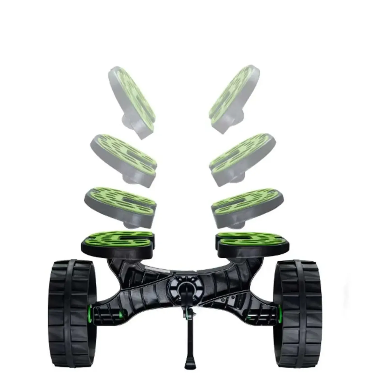 Auf den 10“ (25,4 cm) Rädern ist ein geripptes Gummiprofil aufvulkanisiert, so dass eine laufruhige Fahrt auch auf hartem Boden wie z.B. Asphalt gegeben ist. Gesichert werden die Räder durch unverlierbare Klipse.