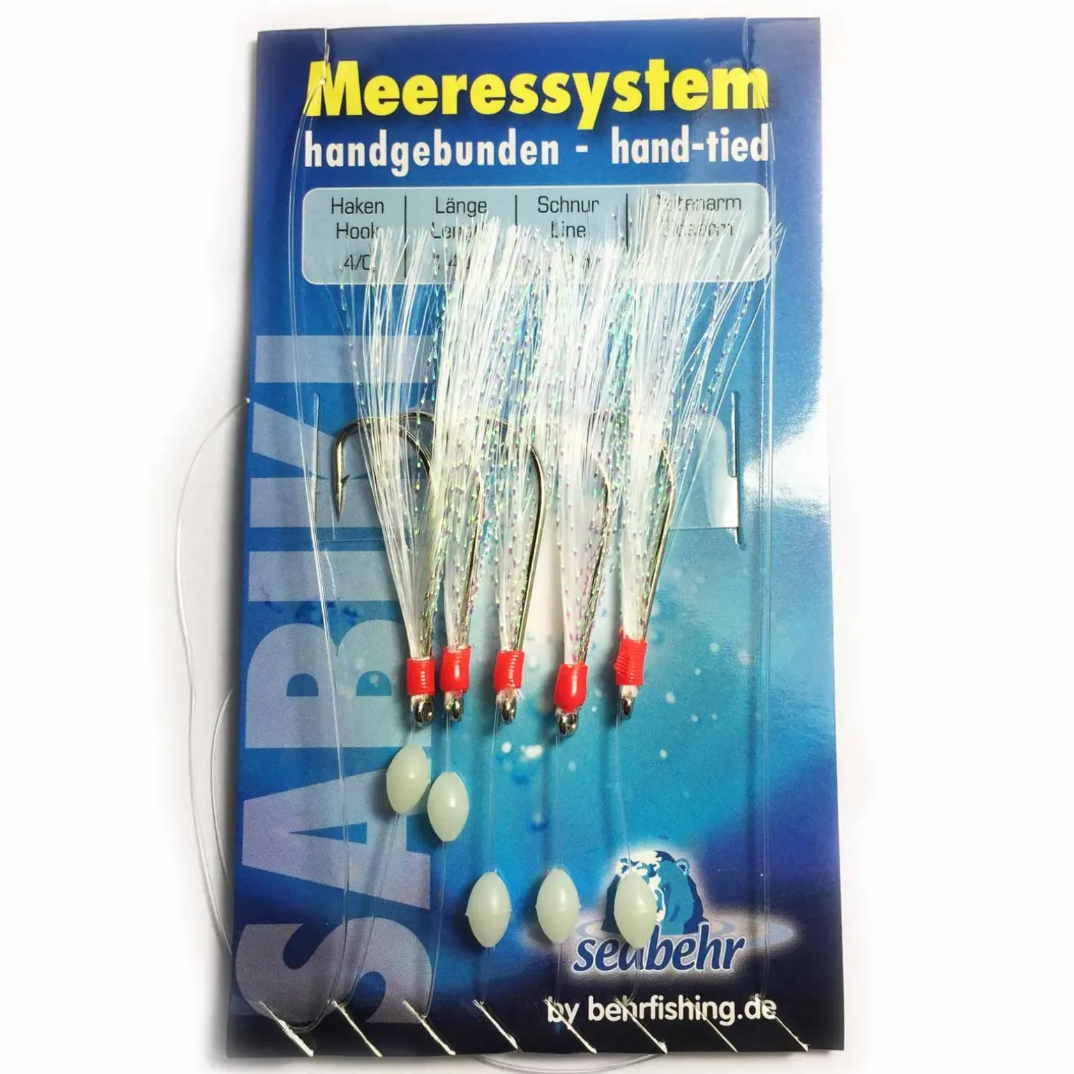 Beliebtes Makrelenvorfach in hochwertiger Ausführung und mit hoher Fangqualität. Ausgestattet mit Glitzerfliegen und selbstleuchtenden Lockperlen.