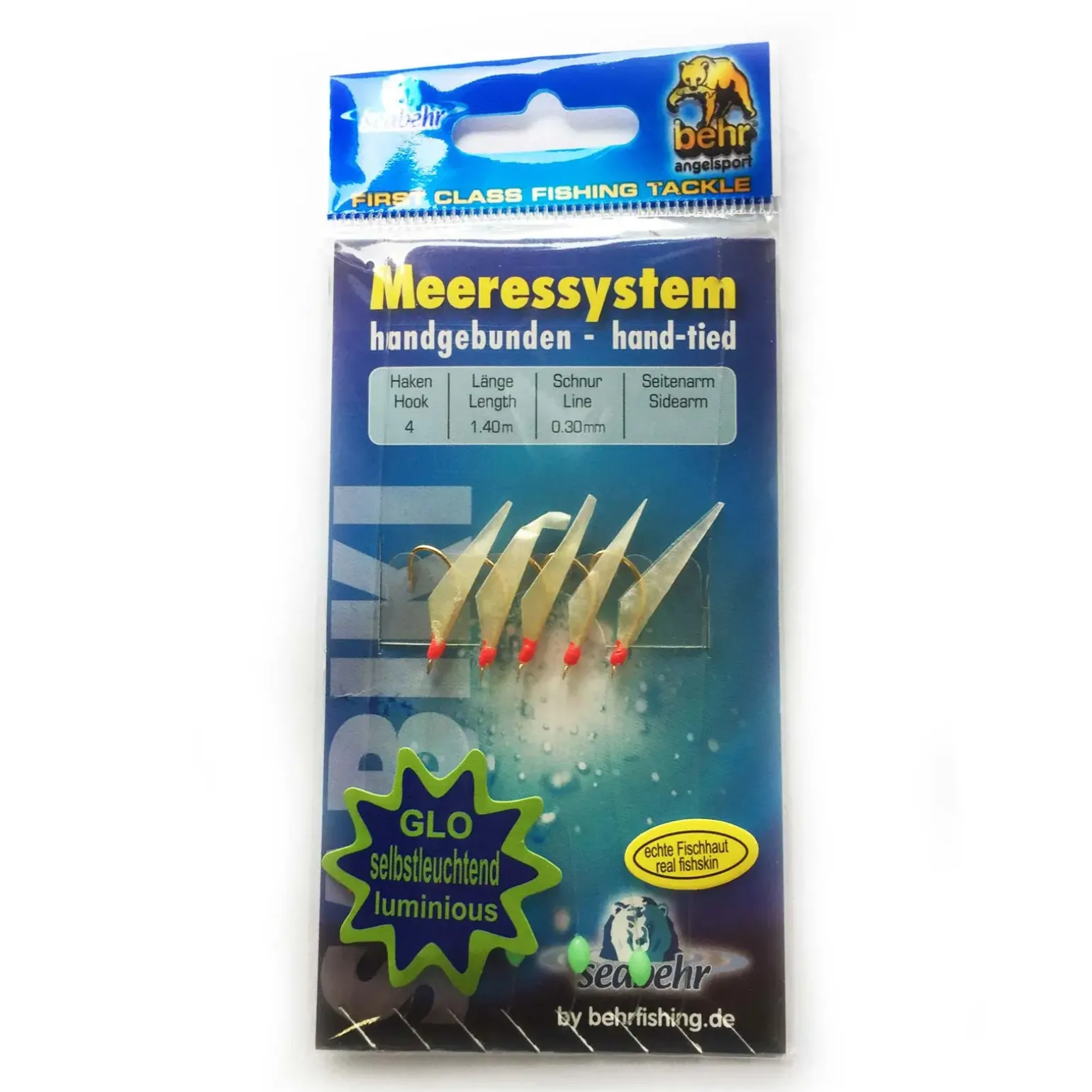 Beliebtes Makrelenvorfach in hochwertiger Ausführung und mit hoher Fangqualität. Ausgestattet mit Goldhaken und selbstleuchtenden Lockperlen.