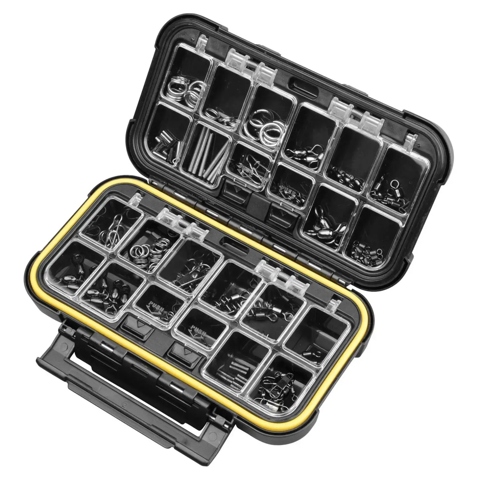 Endlich Ordnung! All die kleinen Zubehörteile wie Wirbel und Co. können in dieser hochwertigen Kleinteilebox übersichtlich gelagert und transportiert werden. Der eng schließende Deckel lässt sich mit den „One Touch“ Federn öffnen und schließen.