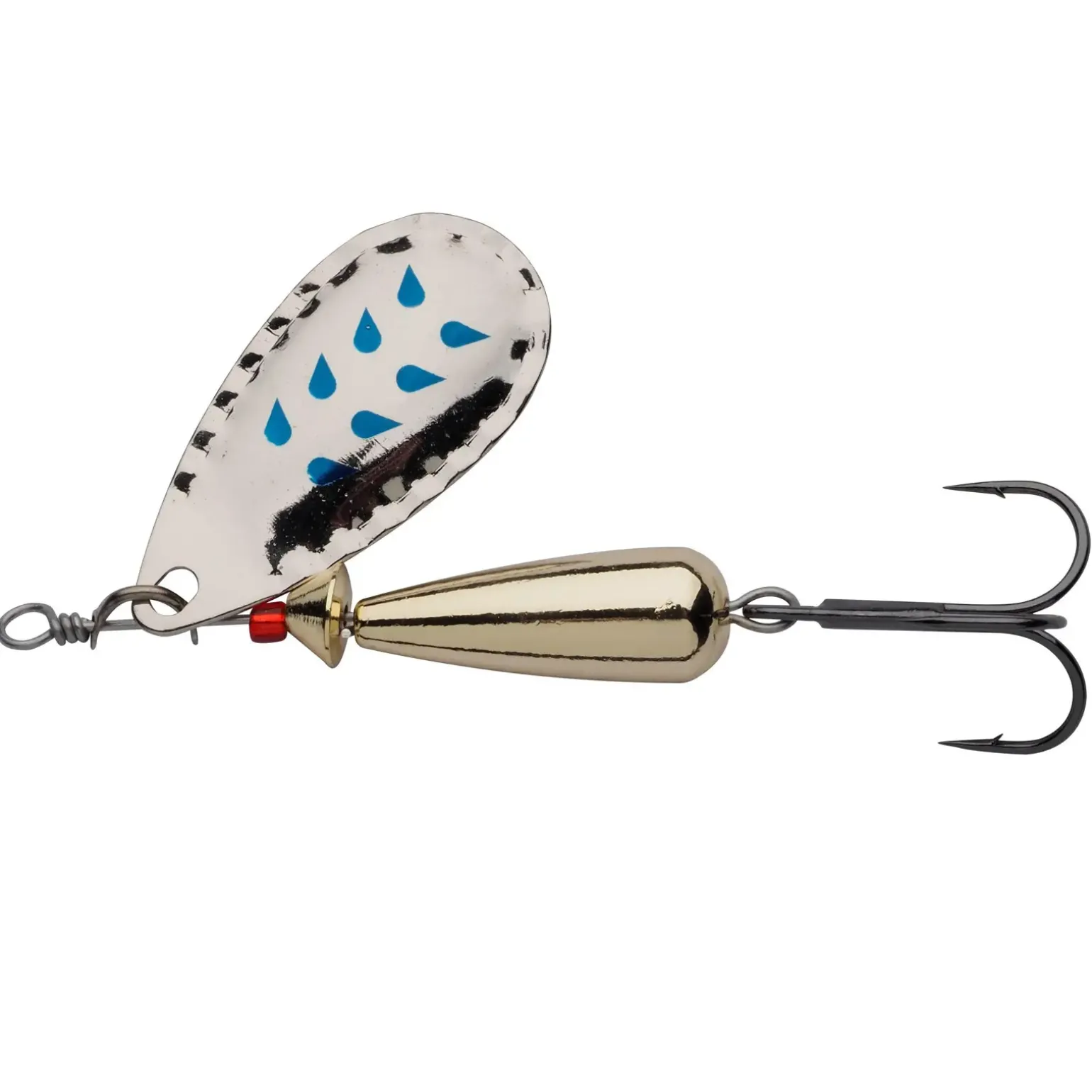Der Droppen verfügt über einen niedrigen Schwerpunkt und lässt sich präzise werfen. Bei Zug beginnt sich das Spinnerblatt sofort und ruck frei zu drehen. Raubfische finden seine Aktion unwiderstehlich.