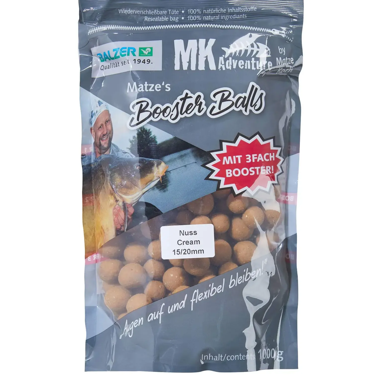 Matze´s neueste Idee: Die Balzer Matze Koch Booster Balls Special Edition! Er kombiniert 15 und 20mm Boilies in einer wiederverschließbaren Tüte … und das mit 6 neuen Aromen!