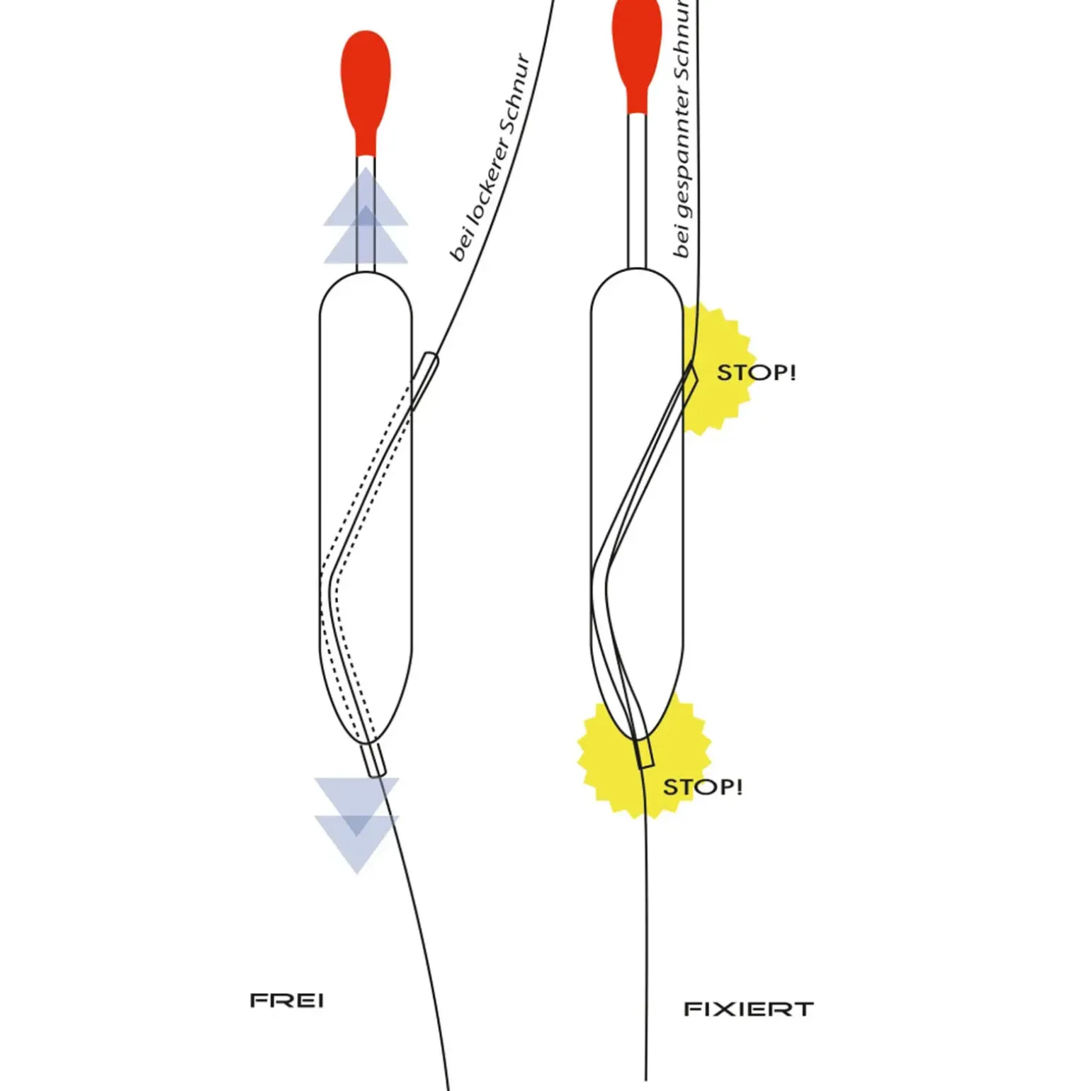 Speziell für das Schleppfischen vom Boot entwickelt. Bei nicht angespannter Schnur läuft die Schnur durch die Pose. Kommt Zug auf die Schnur fixiert sich die Pose von selbst. In der Praxis bedeutet dies, dass die Pose beim Schleppen NICHT in Richtung Köder läuft. Ein entscheidender Vorteil im Vergleich zu herkömmlichen Laufposen!