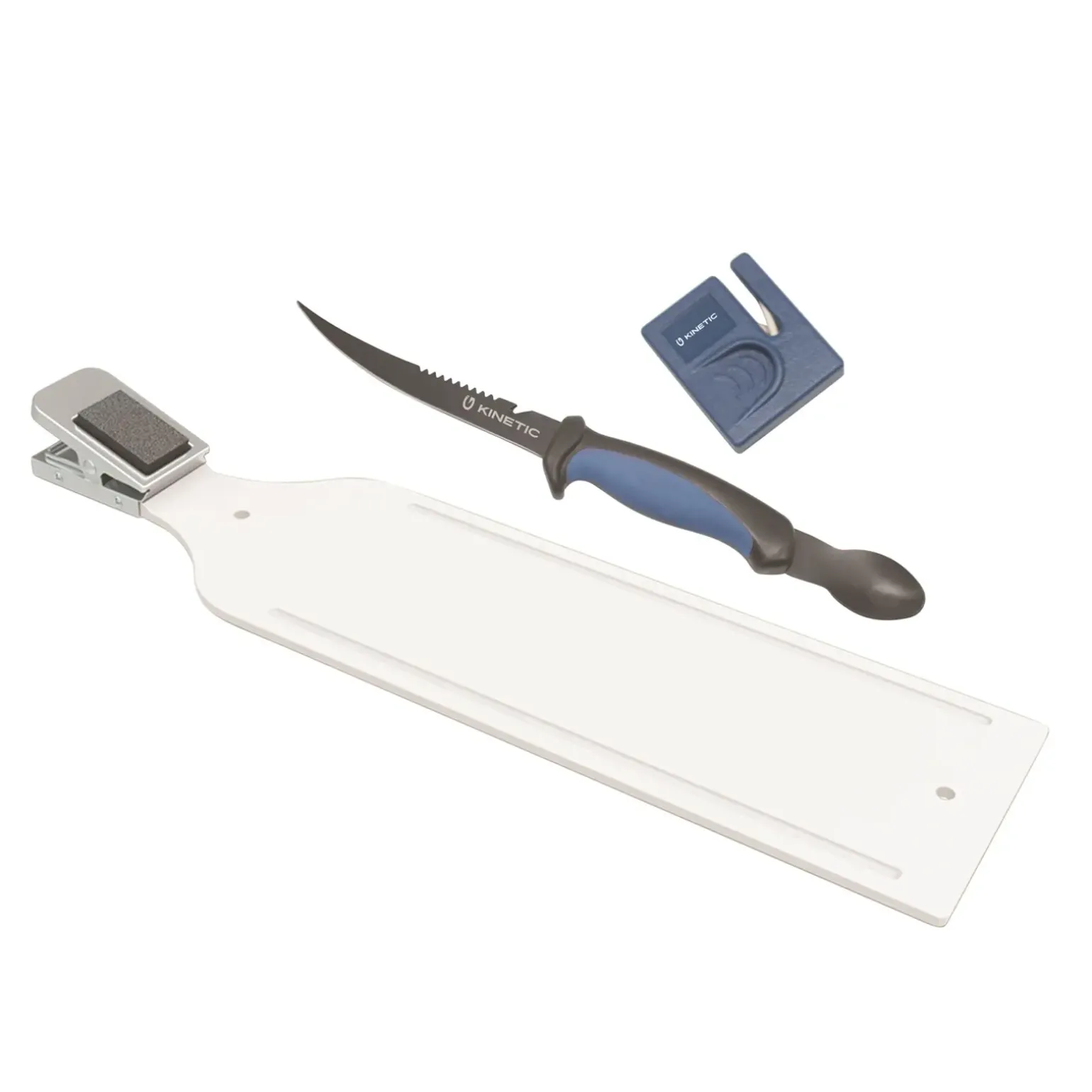 Rasiermesserscharfes Filetiermesser, Schneidebrett und Messerschärfer. Das Filetiermesser ist mit einem starren Löffelwerkzeug zum Entfernen der Innereien ausgestattet.