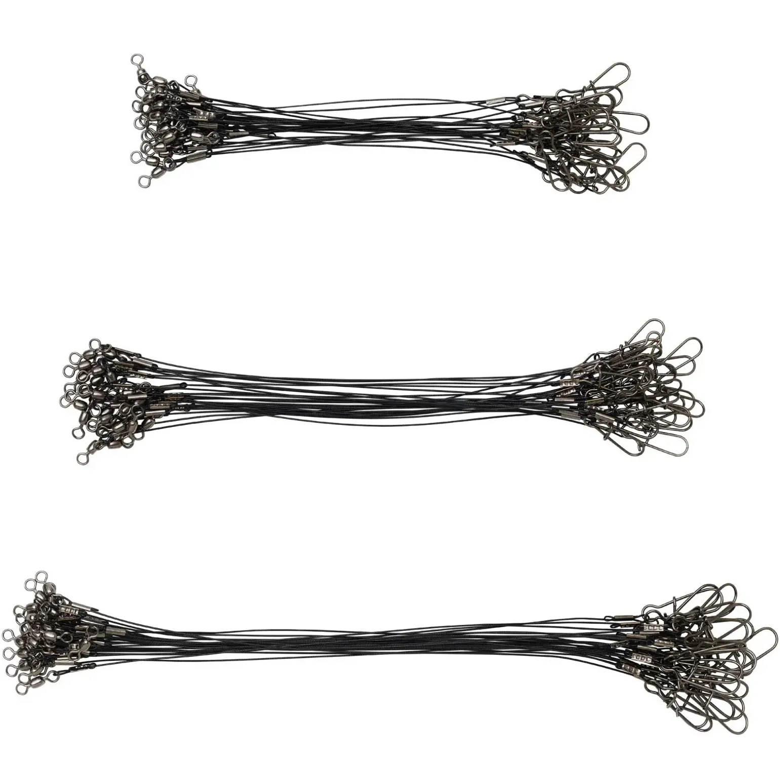 Hier erwarten Sie 72 fertig montierte Stahlvorfächer in 3 unterschiedlichen Längen. Die Stahlvorfächer sind gekrimpt. Die Farbe ist schwarz. An einem Ende befindet sich ein Wirbel. Am anderen Ende ein Karabiner.