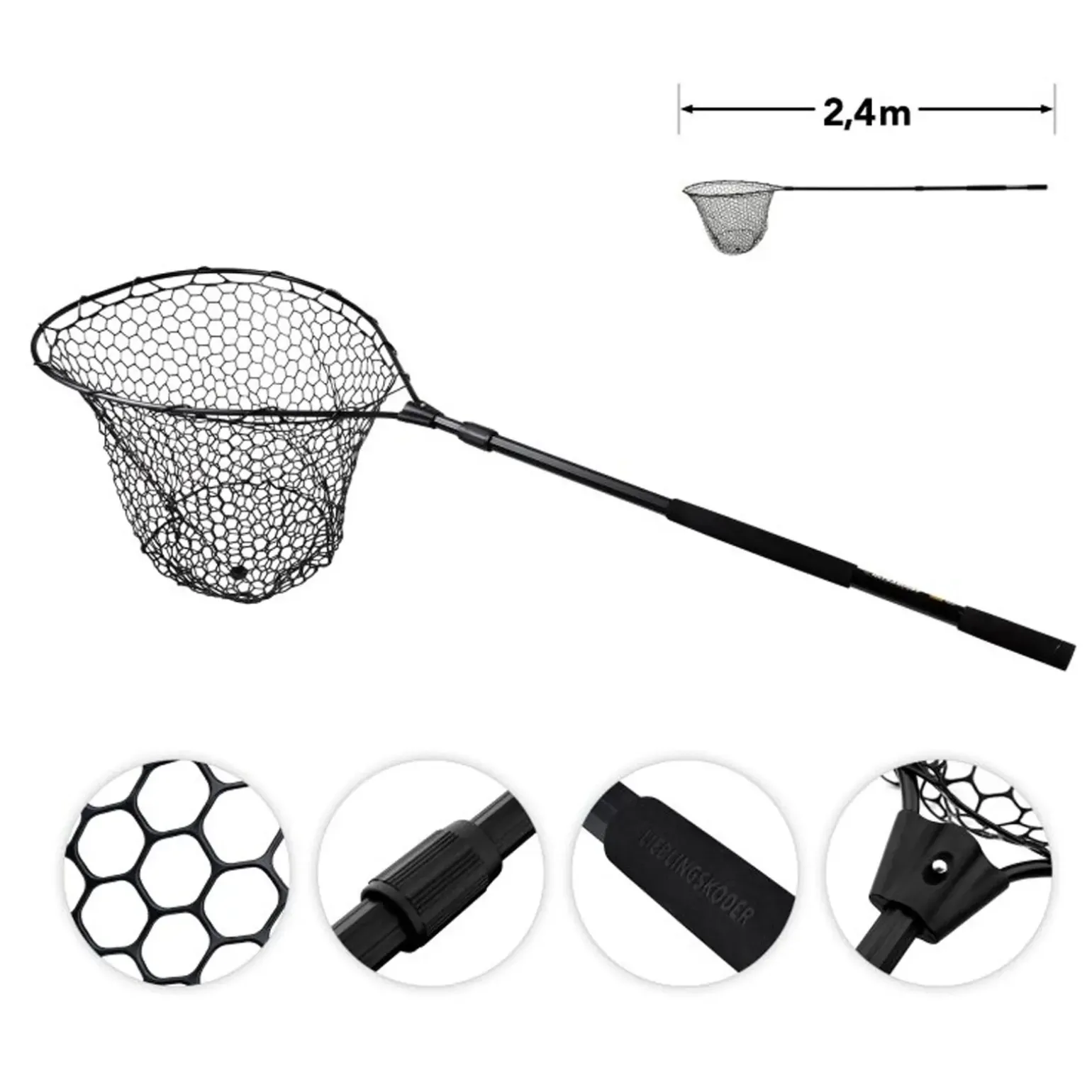 Das hochwertige Vollgumminetz des Lieblingsköder Zander Kescher Ultraboost ist besonders fischfreundlich, hakenfrei und nimmt keinen Fischgeruch an. Es schützt die Schleimhaut der Fische und verhindert, dass sich Wobbler-Drillinge im Netz verfangen – das macht das Hakenlösen besonders einfach und schont gleichzeitig das Material.