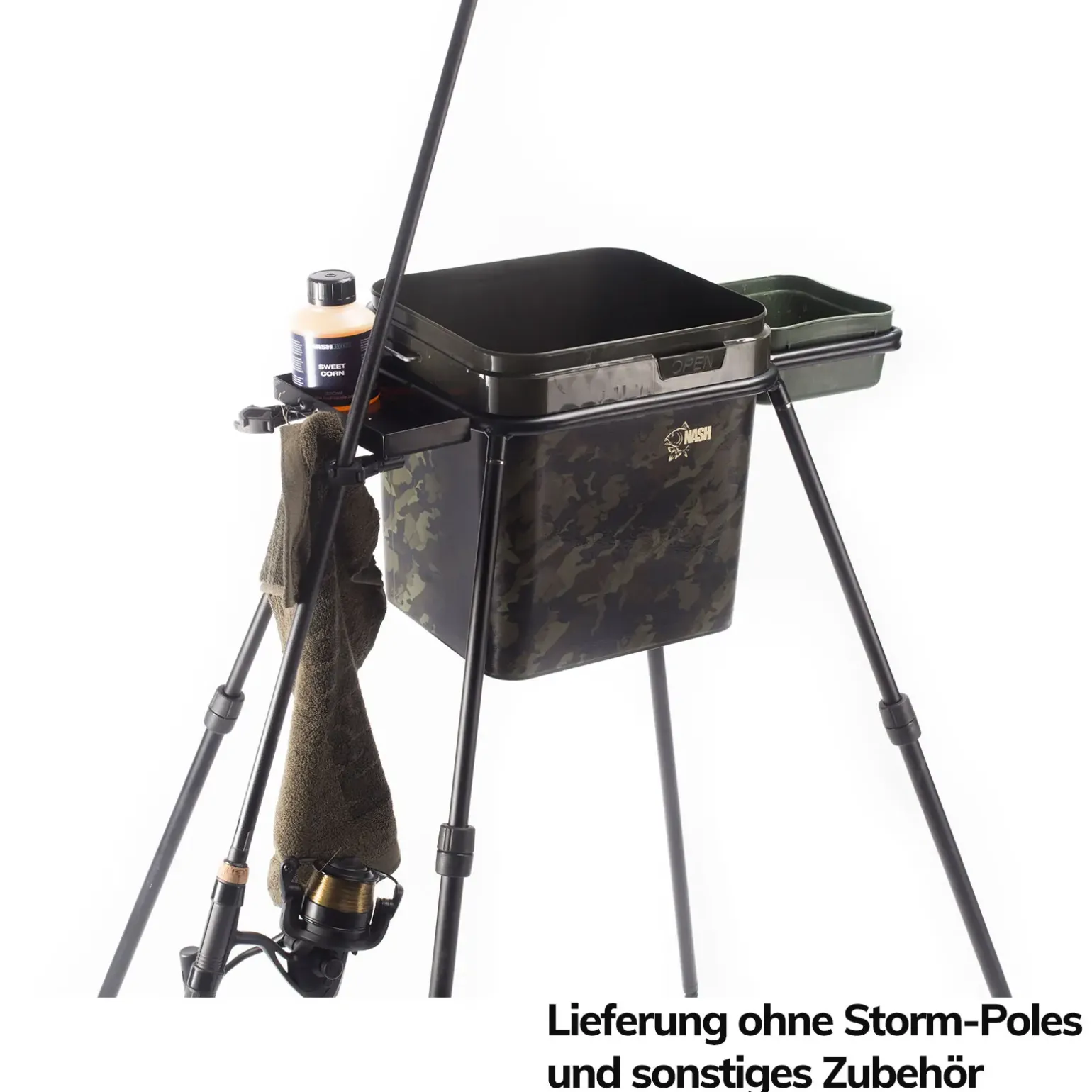 Auf der viereckigen Metallablage sind Fingerschutz, Popup Dosen, Rig-Tools sofort und allzeit griffbereit. Vorgefertigte Rigs lassen sich an die angebrachte Metallöse hinhängen, wenn es einmal hektisch zugeht. An den angebrachten Haken kann ein Handtuch oder ein Trockensack hingehängt werden, damit Boilies beim Füttern mit dem Wurfrohr in Reichweite sind. Auf der gegenüberliegenden Seite ist ein Rahmen für aus dem Matchangelbereich bekannte Behälter angebracht. Diese bietet Platz für PVA-Backs, Sticks oder Wasser um den Spodmix nachzufeuchten oder einfach um die Hände nach dem Anfüttern zu waschen. An die zwei am Rahmen angebrachten 3/8“ Innengewinde können Butt Locks (nicht inklusive) eingeschraubt werden um damit aktuell nicht verwendete Ruten zu fixieren.