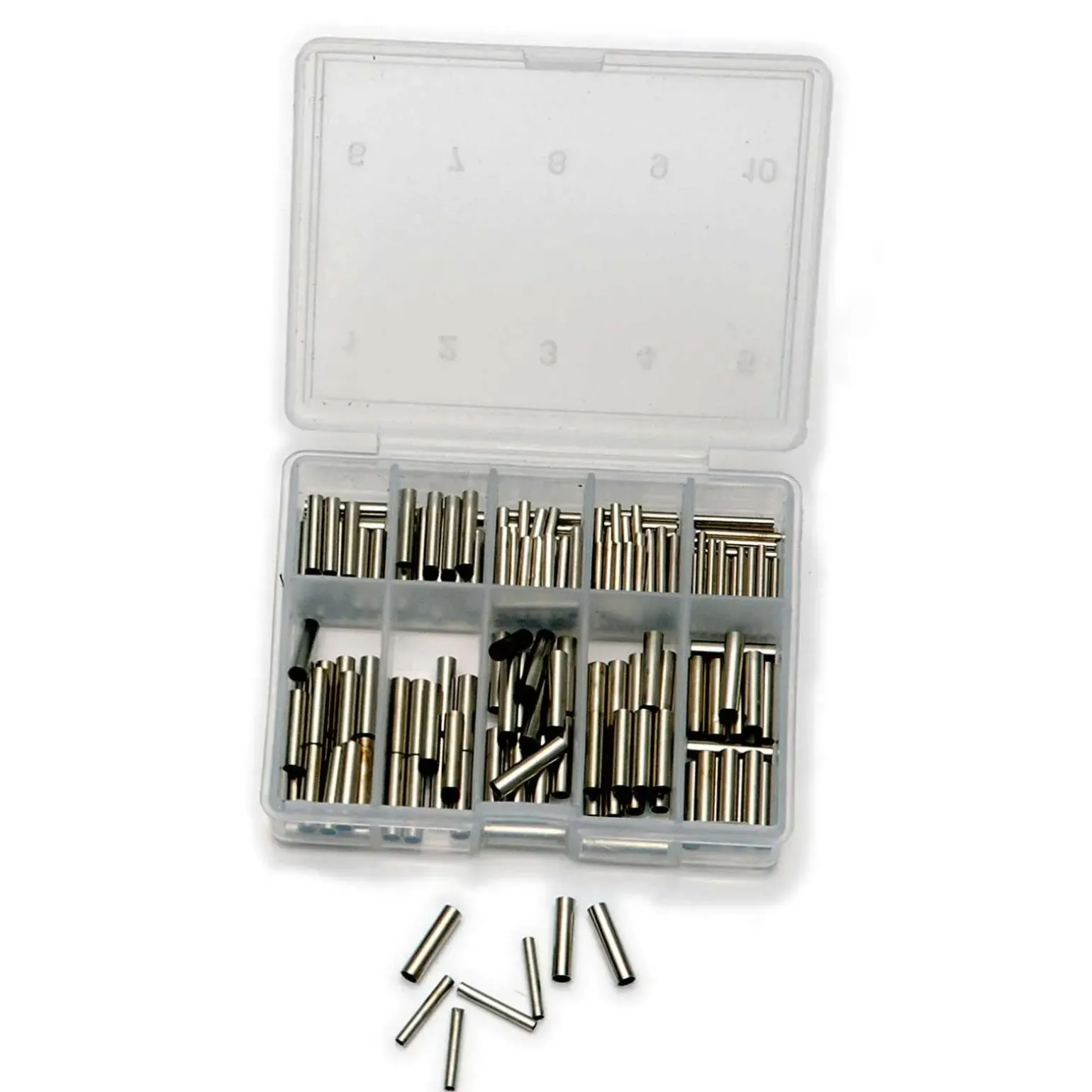 In diesem Sortiment erhalten Sie 210 Klemmhülsen zur Montage von Stahlvorfächern.